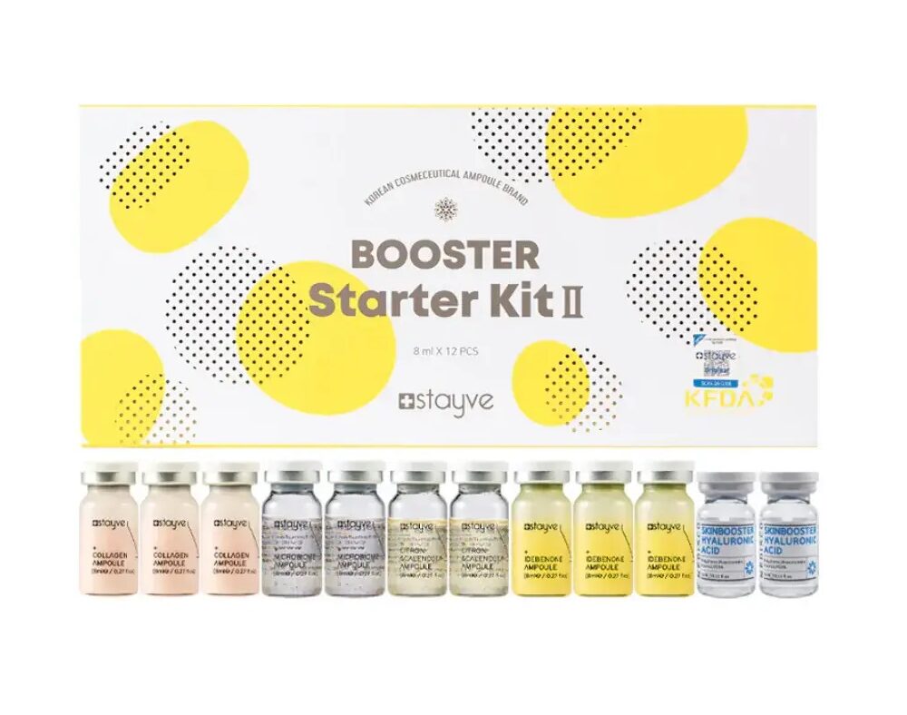 Booster Kit 2 – contains 12 8ML ampoules: 3x Idebenone Ampoules, 2x Medisco (5ml) Hyaluronic Acid Ampoules, 2x Citron and Calendula Ampoules, 2x Microbiome Ampoules, 3x Collagen Ampoules